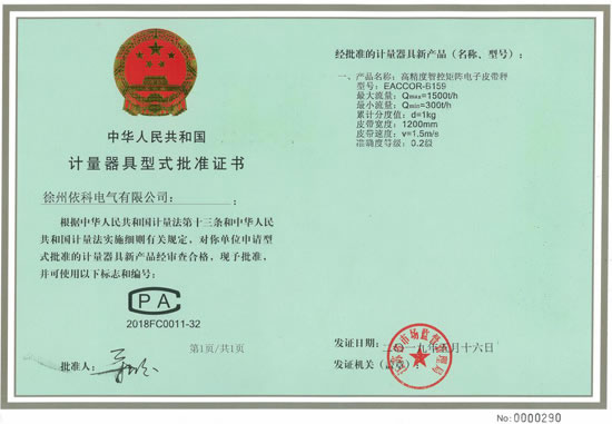 熱烈祝賀徐州依科電氣有限公司專利技術(shù)高精度智控矩陣電子皮帶秤EACCOR-B159獲得0國家0.2級計量證書CPA2018FC0011-32批準證書,配套高精度矩陣傳感器及矩陣智能稱重控制器(采用SEQ-AI智能算法,矩陣控制跟蹤復核技術(shù),...